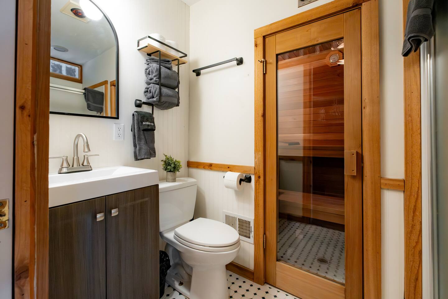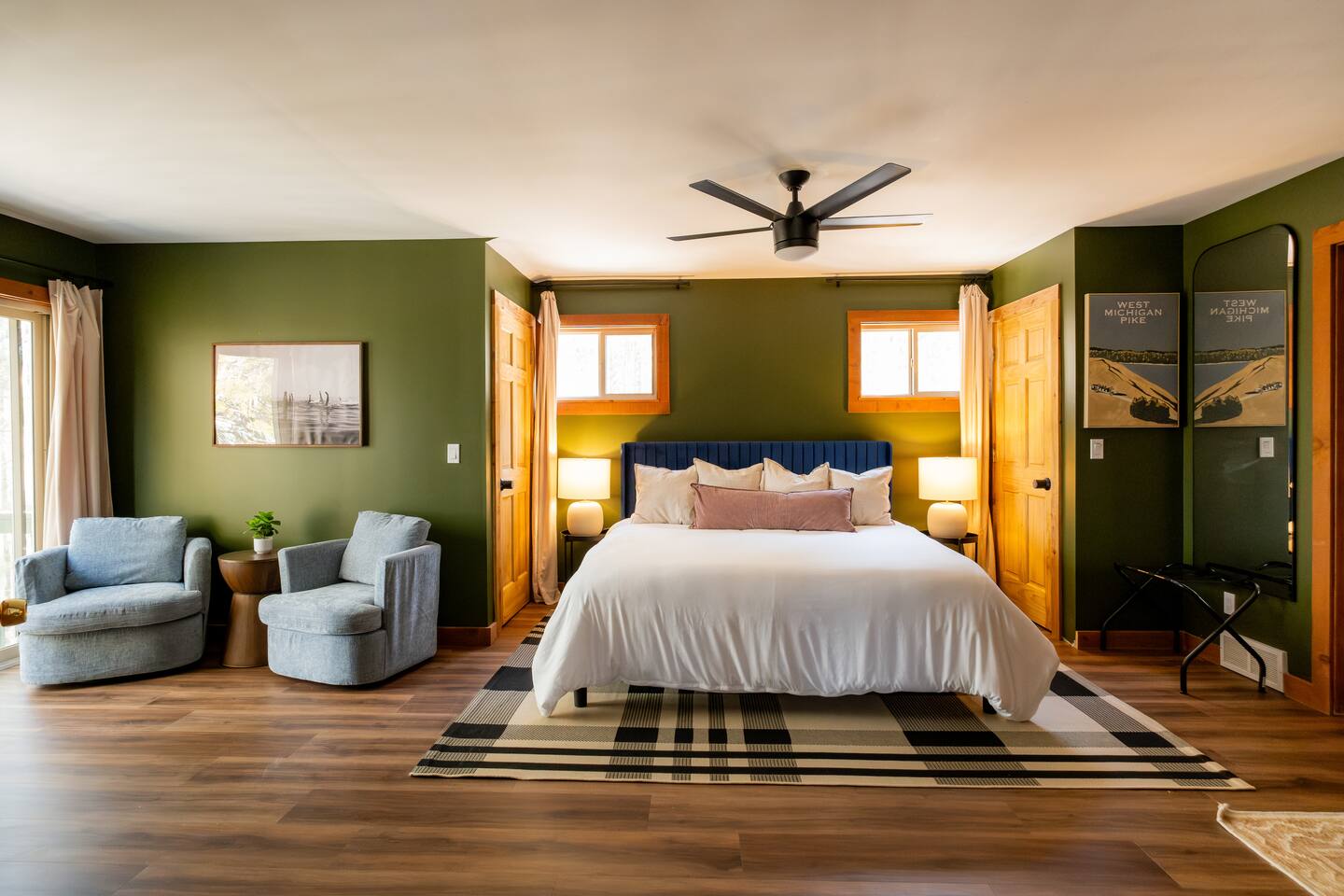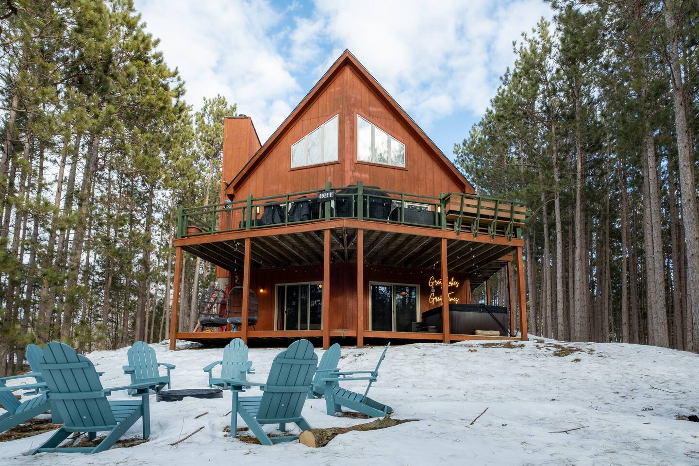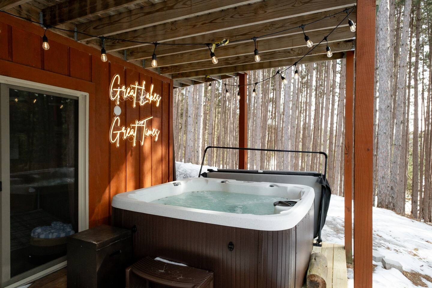 KEY FEATURES ⭐️ Modern & Rustic Charm: Thoughtfully renovated 4-bedroom cabin (1 King, 5 Queens), blending contemporary comfort with rustic appeal. ⭐️ Sleeps 12 comfortably in beds, optional up to 14 with the sleeper sofa. ⭐️ Family & Pet Friendly: Pack ’n Play available; well-behaved dogs welcome. ⭐️ Chef’s Kitchen: Fully equipped kitchen with gas range oven, full cookware set, air fryer microwave, toaster, full-size fridge with filtered water/ice dispenser, Ninja blender, a Keurig machine (grounds & K-Cups), and Cosori kettle. INSIDE THE CABIN 🛏 Bedrooms & Baths: 4 bedrooms (1 King, 5 Queens) + optional sleeper sofa. Three full baths—one with a tub/shower combo and two with stand-up showers—stocked with hair dryers, shampoo, conditioner, and body wash. 🔥 Cozy Fireplaces: Two inviting fireplaces (one wood burning, one electric) set the perfect ambiance in separate living areas. ENTERTAINMENT & LEISURE 🎬 Hidden Speakeasy: 100" movie screen and popcorn machine for epic movie nights 🎤 Karaoke lounge: Belt out your favorite tunes ⛳️ High-Tech Golf Simulator: Tee up indoors, rain or shine 🍻 Sports-Themed Bar: Featuring bar seating, a 65" TV, and a cozy electric fireplace, plus a pool table, sleeper sofa, and a giant bean bag chair. 🕹 Games Galore: Poker table, PacMan, Buck Hunter, air hockey, plus board games & cards 📺 5 Smart TVs: Stream your favorites, including on the 100" theater screen 🎶 Record Player: Enjoy classic vinyl vibes OUTDOOR LIVING 🌲 Multiple Lounging Areas: Perfect for alfresco dining and relaxation, including sectional and dining table that seats up to 12. 🔥 Two Fire Pits: A gas fire pit on the upper deck + a wood-burning fire pit in the yard (complete with Adirondack chairs and doubles as a grill. BYO firewood!) 🍔 4-Burner Gas Grill: Perfect for BBQ feasts 🧖♀️ Hot Tub & Sauna: Unwind indoors or out 🎯 Outdoor Games: Bags, ladder toss and giant Connect-4 TECH & HOUSE EXTRAS ⚡️ Spectrum Fiber WiFi: 1-Gig ultra fast, reliable high speed internet for streaming and remote work 🧺 Laundry: Washer & dryer WHAT WE PROVIDE • Fresh linens & towel sets • Starter coffee kit (K-Cups, small jar of grounds, filters, sugar) and complimentary assortment of teas • Cooking essentials (oils, spices, salt & pepper), mixing bowls, measuring cups and spoons, Tupperware, utensils, dinner ware, cocktail set, bakeware, foil, plastic wrap, ziplock bags in various sizes • 3 rolls of TP/bathroom, 2 rolls of paper towels, garbage bags, dishwasher pods, dish soap and sponge • Hand soap, shampoo, conditioner, shower gel • Luggage Racks & Hangers for convenient unpacking YEAR-ROUND DESTINATION 🌞 Summer: Enjoy boating, swimming, and water sports on pristine Torch Lake, just minutes away. Perfect for beach days and lakeside adventures. 🍁 Fall: Experience breathtaking autumn foliage, visit nearby apple orchards and cider mills, and explore scenic hiking trails as the colors change. ❄️ Winter: Just a short drive to top ski resorts including Shanty Creek and Boyne Mountain. Ideal for skiing, snowboarding, and cozy cabin retreats after a day on the slopes. 🌷 Spring: Witness Northern Michigan's beautiful wildflower blooms, enjoy early-season fishing, explore uncrowded hiking trails, and visit local farmers markets as they open for the season. We can't wait to welcome you to your home away from home. The Wild Pine at Torch Lake is the ideal basecamp for exploring Northern Michigan's breathtaking nature trails, crystal-clear Torch Lake waters, acclaimed local wineries, and charming small towns — or simply staying in to enjoy quality time with family and friends in our amenity-packed retreat. 🍂 FALL & WINTER GETAWAY AWAITS! ❄️ Discover The Wild Pine this season—where crisp autumn hikes and colorful foliage give way to snowy ski days and cozy nights by the fire. Whether you’re carving slopes nearby, soaking in the hot tub under the stars, or unwinding in the sauna, our modern cabin is your perfect year-round retreat.